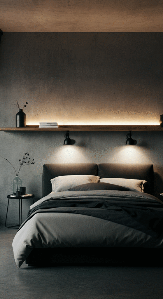 Floating shelves add functionality without cluttering the visual space. They look almost weightless against the concrete and are perfect for displaying books, essentials, or small décor pieces.