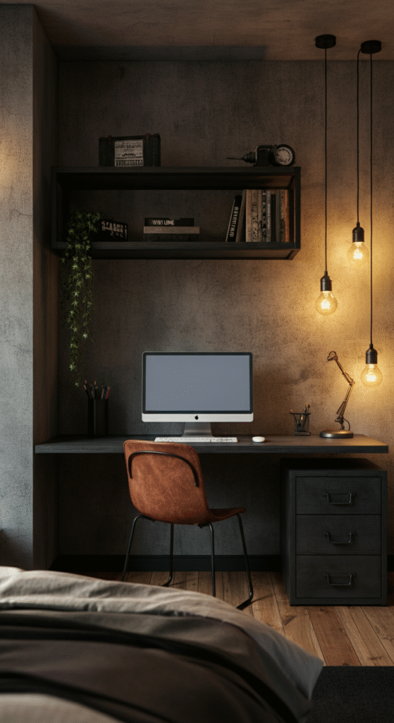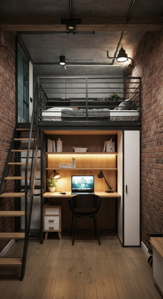 All you need is a sleek metal desk, overhead shelving, and warm industrial lighting. The bed area and work area should feel connected yet clearly defined.