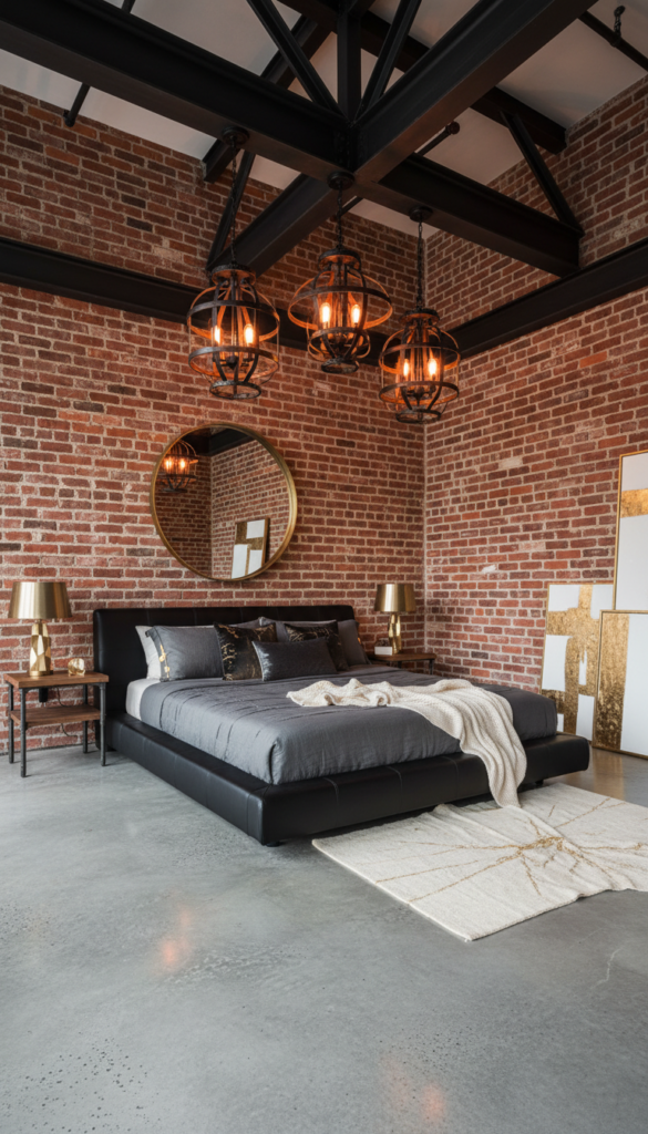 Description: Imagine high ceilings with steel beams, a polished concrete floor, and a striking black leather bed frame. Industrial chandeliers with Edison bulbs can add an element of vintage charm, while sleek, modern furniture adds luxury and comfort. The use of neutral colors like charcoal, gray, and black enhances the raw appeal, while gold or brass accents offer a touch of refinement.