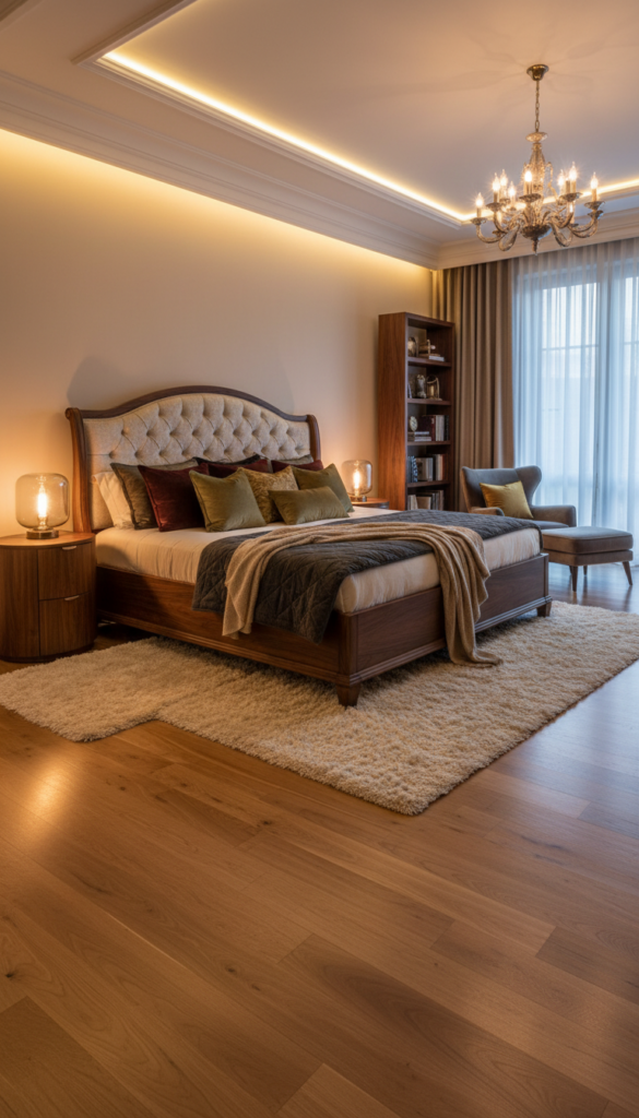 Description: Think of a large wooden bed frame with a plush upholstered headboard. Add a thick, cashmere throw blanket and velvet pillows to contrast the rich wood tones. Walnut or oak flooring with soft rugs underfoot creates a cozy, high-end feel. A combination of soft lighting from pendant fixtures and recessed lighting adds warmth and depth.
