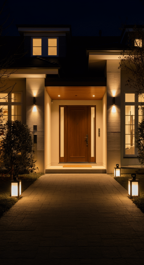 The placement is everything. Corners, porch steps, and entry pillars are ideal spots because they frame the home beautifully and create a pathway of light that feels inviting.