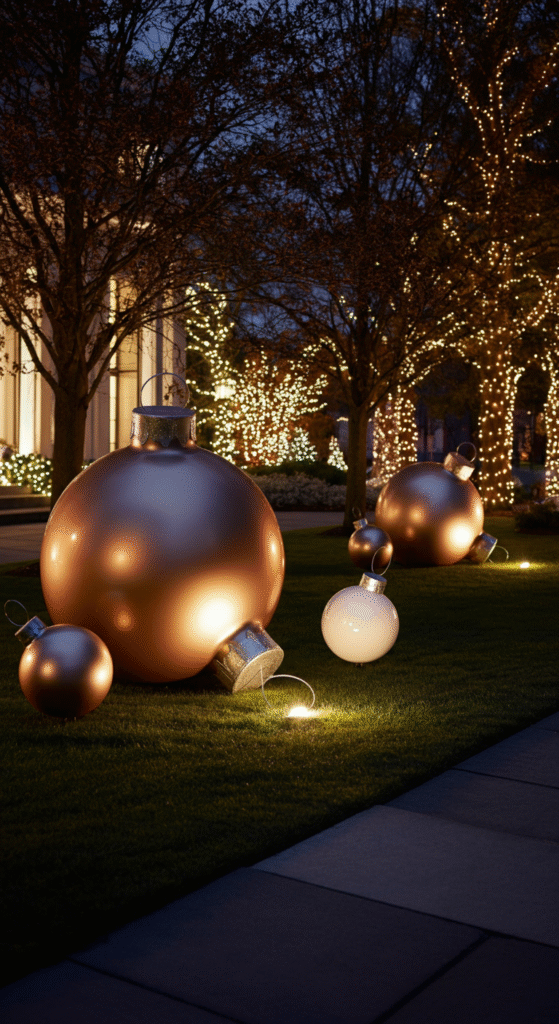 Luxury decor often follows one strong principle: less but bigger. Oversized ornaments can make your yard look grand without overwhelming it. Think giant matte-finish baubles in champagne gold, soft pearl white, forest green, or even satin black for a bold but refined statement.