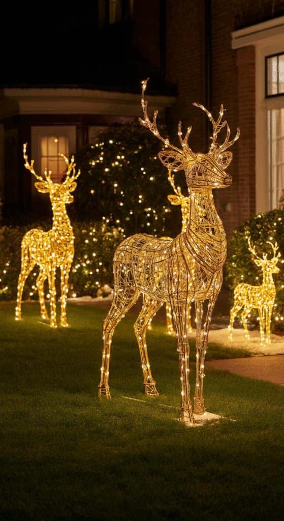 If you have a pathway or a long driveway, a symmetrical pair of tall reindeer or modern tree silhouettes on each side creates a grand, estate-like effect.