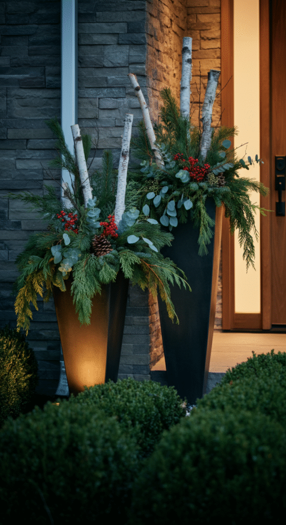Use tall, elegant planters in materials like stone, concrete, black metal, or brushed gold. Fill them with winter greens such as cedar, spruce, and pine branches. Add touches of eucalyptus, berries, birch logs, or velvet ribbon for texture.