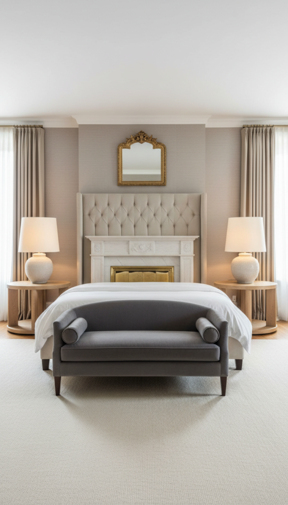 This aesthetic focuses on symmetry, crisp linens, and integrated living areas. It’s perfect for large rooms because it utilizes space for more than just sleeping, often incorporating a lounge area or a writing desk.