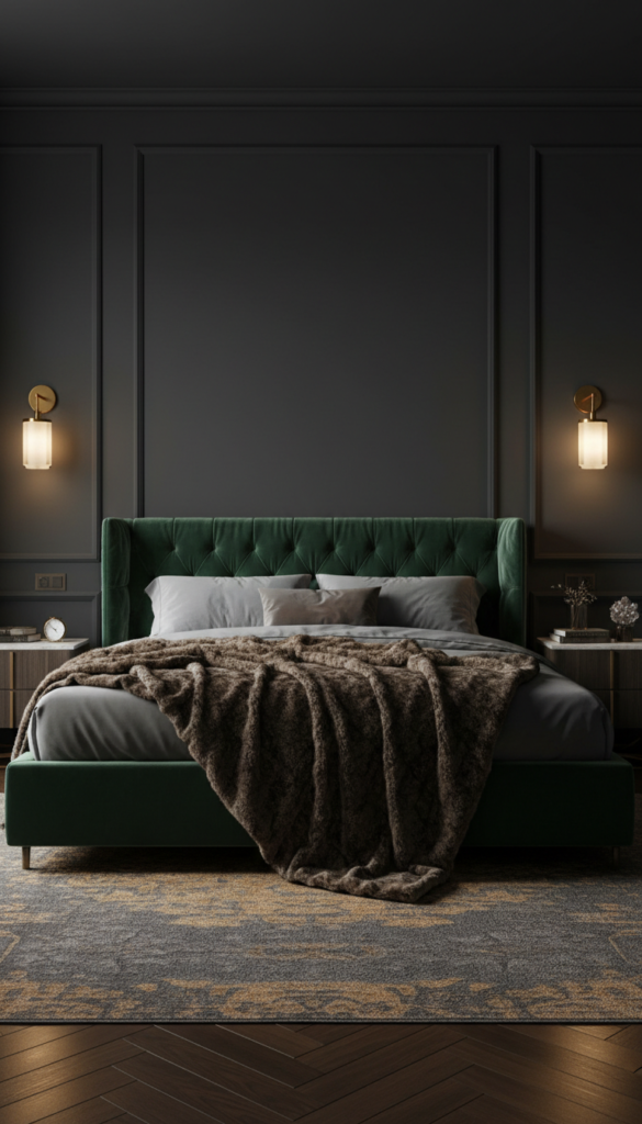 - Metallic Accents: Add gold or brass hardware on nightstands and light fixtures to pop against the dark background.