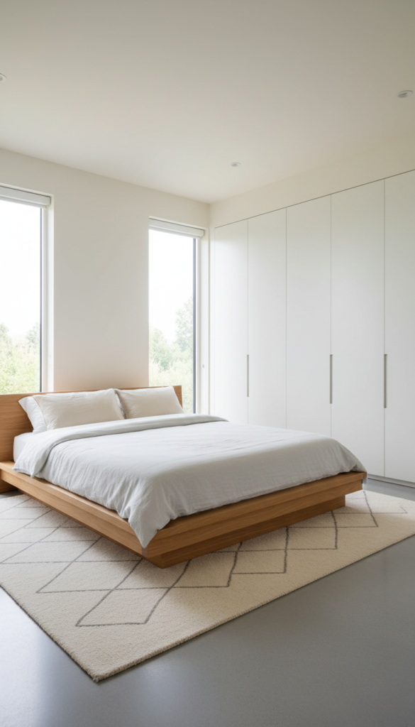 Luxury doesn’t always mean “more.” In a large bedroom, minimalism feels intentional and airy. This look is about clean surfaces, low-profile furniture, and a sense of calm.