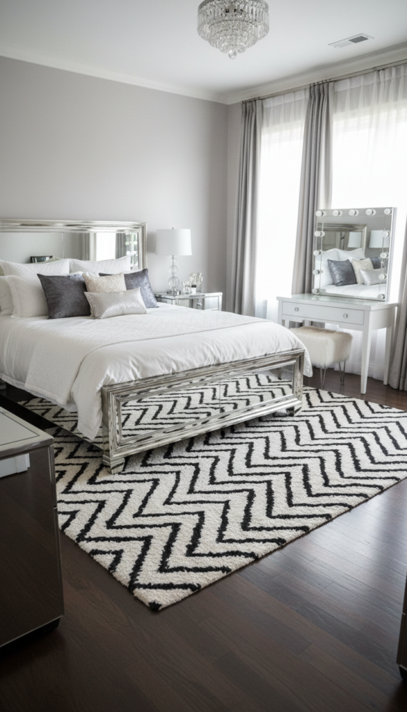 - Bold Patterns: Use a black-and-white geometric rug or wallpaper to make a bold statement.