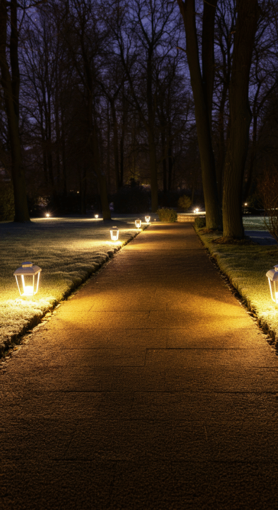 Warm white lanterns mimic candlelight but without the worry of wind or flame. Their golden tone creates a cozy winter glow that makes visitors feel guided and welcomed. This design works beautifully for long driveways, short garden paths and even entry steps.