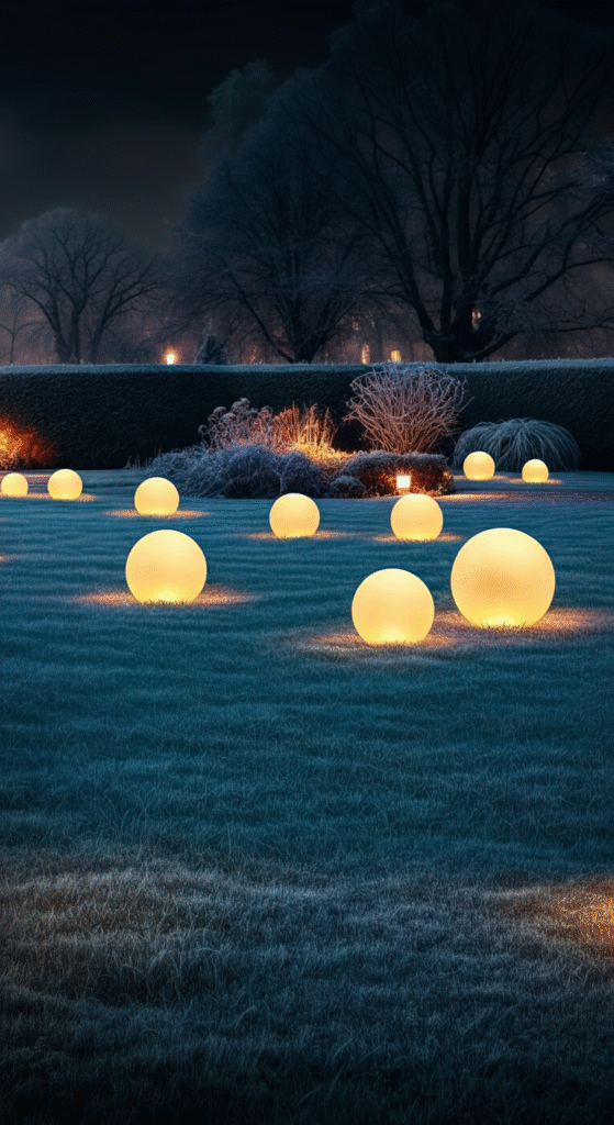 Oversized glowing spheres placed across the lawn create a sculptural display that feels artistic and modern. They can be arranged in clusters, lined neatly or scattered randomly for a whimsical touch. The soft internal glow gives the impression of floating ornaments resting on the grass.