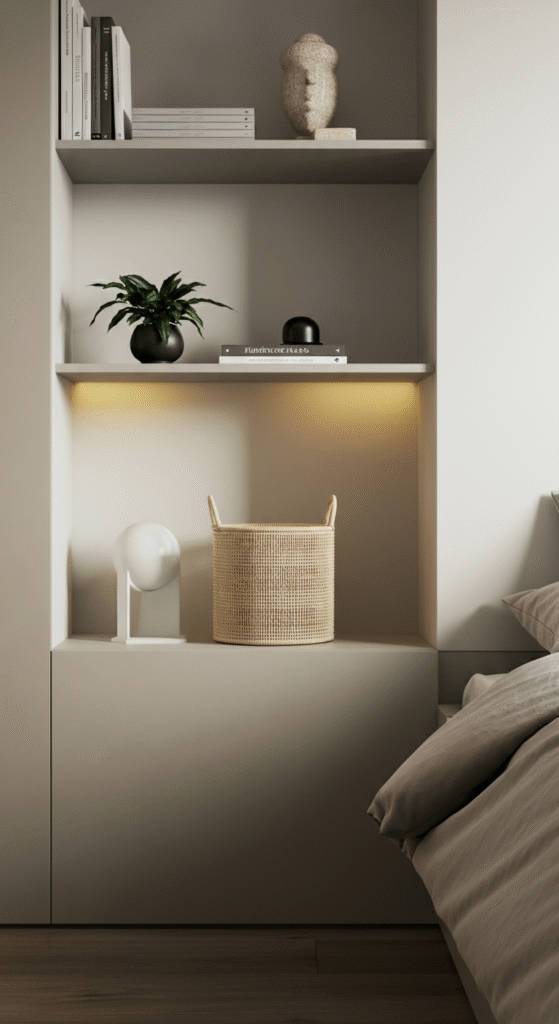 While it may seem counterintuitive to include open shelving in a minimalist bedroom, when done correctly, it can help maintain a sleek, organized space. Opt for floating shelves with minimalistic brackets or open cubbies that keep your room feeling light and airy.