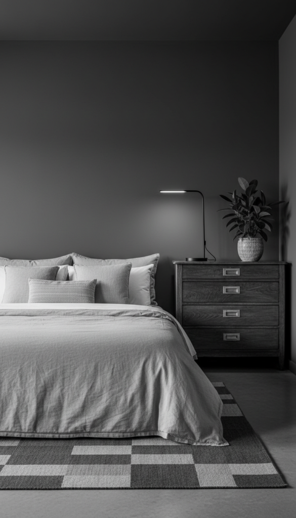 Did you know? In a monochrome bedroom, statement furniture can be as impactful as a piece of art. A bold, dark armchair or a vintage lamp could add a surprising layer of sophistication.