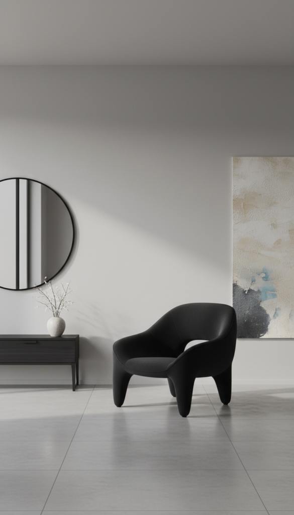For instance, you can incorporate minimalist furniture pieces in a rich dark hue, such as a statement chair or a bold bookshelf, to complement the overall tone of the room. A beautifully crafted black dresser against a muted grey backdrop can serve as a striking focal point.