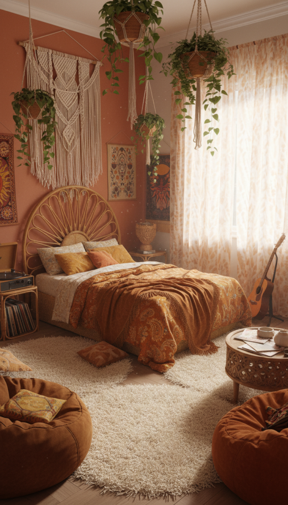 The 1970s brought an explosion of texture and earth tones. This “hippie chic” aesthetic is perfect for a bedroom because it prioritizes relaxation and nature. It feels collected, cozy, and effortlessly cool.