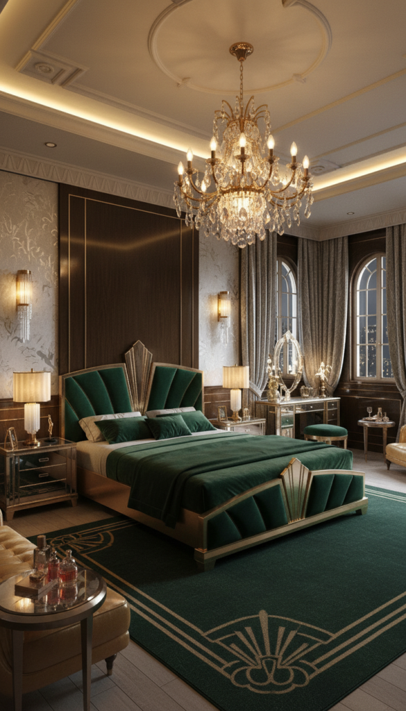 For those who want their bedroom to feel like a luxury hotel from the Jazz Age, Art Deco is the answer. Popular in the 1920s and 30s, this style screams opulence, featuring bold geometric shapes and rich materials.