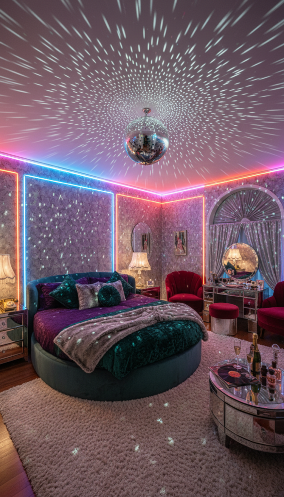 Distinct from the boho 70s look, Disco Glam focuses on the nightlife of the era. It is flashy, fun, and perfect for anyone who wants their bedroom to feel like a party. Think Studio 54 meets modern luxury.