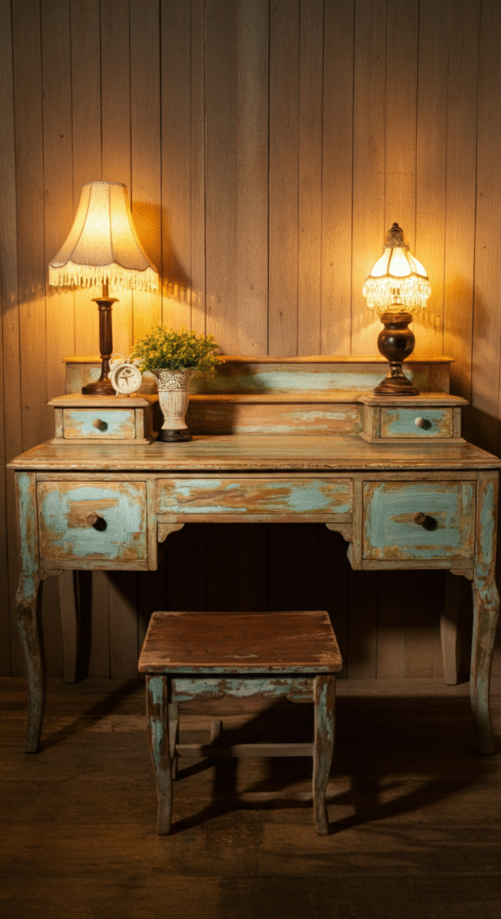 Distressed wood is one of the strongest rustic design signatures. It looks aged, weathered, and full of personality. A distressed wood vanity works especially well if your bedroom has neutral walls, muted linens, or soft curtains because the furniture adds contrast without being loud.