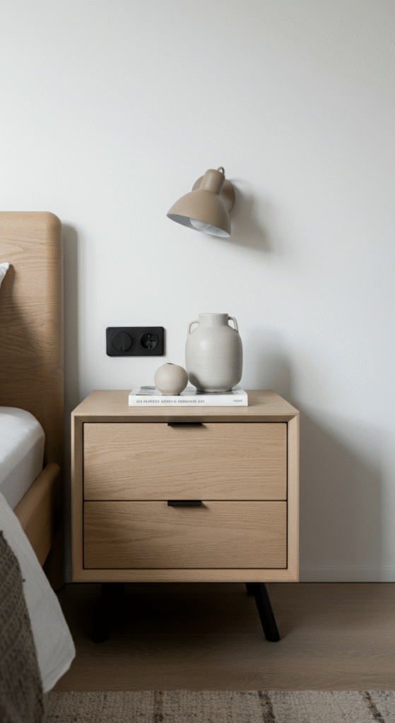 Opt for materials like matte metal, light oak, or walnut veneer for a refined touch. Floating nightstands are an excellent choice, giving your room an airy, uncluttered feel.