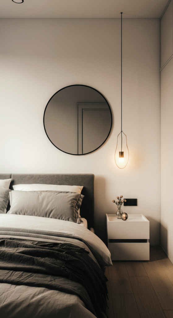 A statement mirror is one of the easiest ways to elevate a bedroom’s visual appeal while maintaining a sleek, modern edge. Whether it’s a tall floor mirror with a thin black metal frame or a circular wall-mounted design, mirrors add both style and functionality.