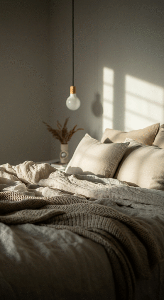 Crisp white sheets, soft gray duvets, and beige throws create a calm base, while linen, cotton, and wool layers add tactile warmth. Mixing different fabrics can make your bed the focal point of the room without cluttering it visually.