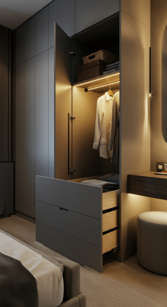 Think low-profile dressers, under-bed storage drawers, or built-in wall cabinets with hidden handles. Modular storage units with matte finishes can help you maintain a streamlined appearance while adapting to your changing needs.