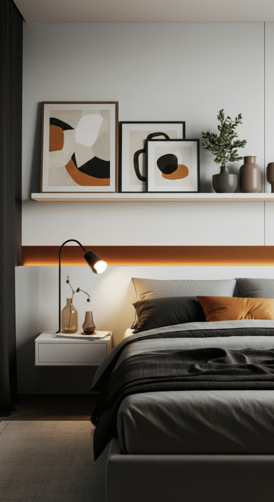 Art in a modern bedroom should feel intentional, not overwhelming. That’s where floating shelves and minimalist wall art come in.