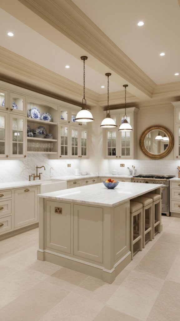 Traditional design doesn’t have to feel heavy or cluttered. In a small kitchen, you can achieve elegance through thoughtful details like crown molding, glass-front cabinets, and marble (or marble-look) surfaces. This style feels established and sophisticated.