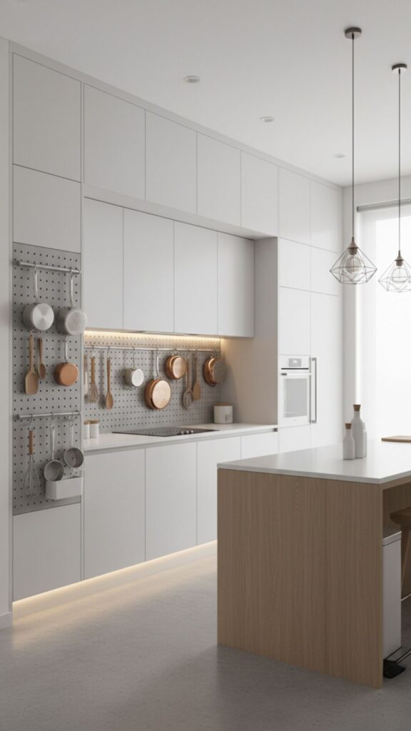- Use pegboards to hang pots, pans, and utensils on an empty wall.