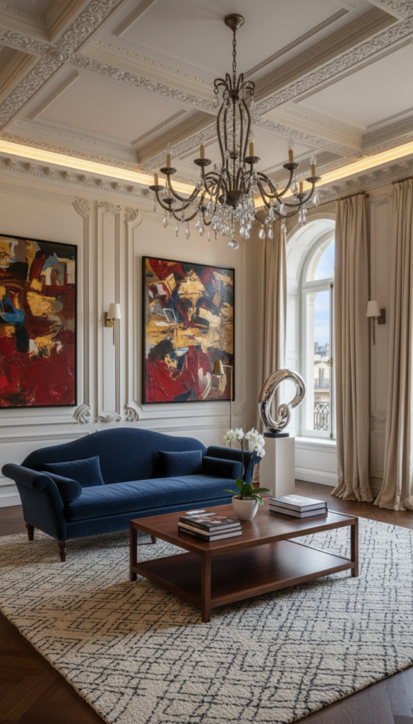 - Contrast elaborate molding or vintage rugs with sleek, low-profile modern seating.