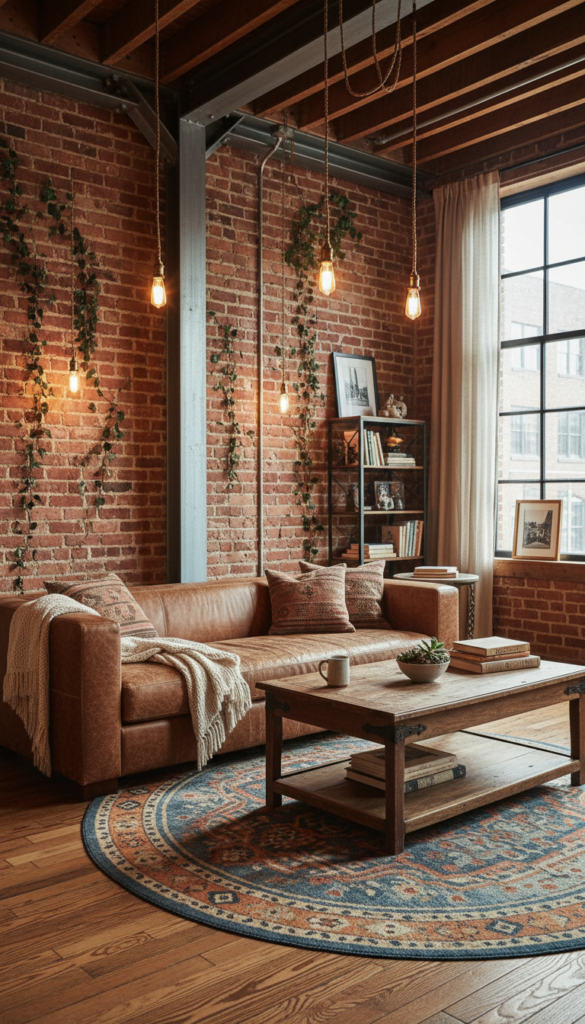 This style creates a cozy, lived-in vibe by blending the raw edges of industrial design (metal, concrete) with the warmth of rustic vintage farmhouses.