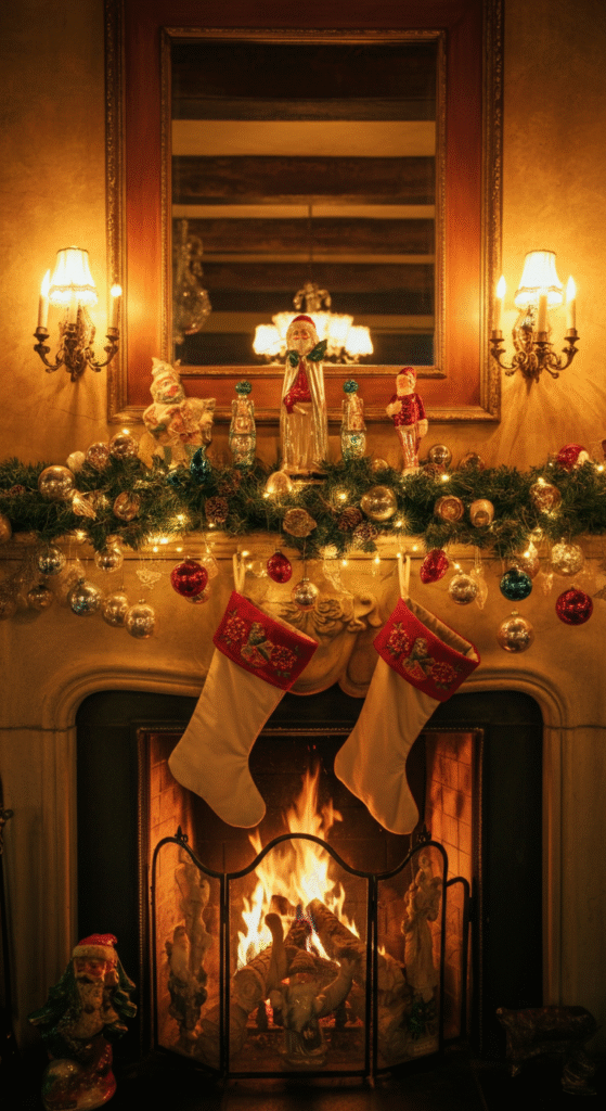 Step back in time and create a vintage-inspired Christmas fireplace. Use antique-looking ornaments, retro-style stockings, and classic red and gold decorations to bring that old-fashioned charm to life.