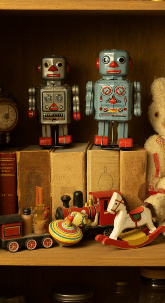 Imagine a detailed shelf packed with old-school toys from the 1950s to 1980s: wooden trains, tin robots, spinning tops, and a worn-out stuffed rabbit. The entire piece looks like a still-frame from a grandmother’s attic or a forgotten childhood memory.