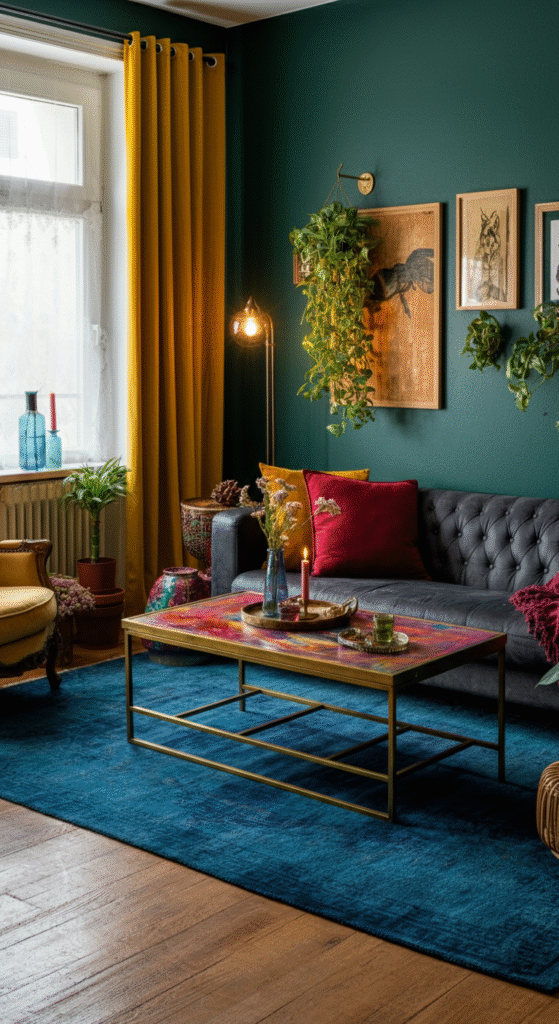 Use rich, vibrant hues like deep blues, emerald greens, and mustard yellows in accent walls, throw pillows, and rugs to create a dynamic and welcoming space.