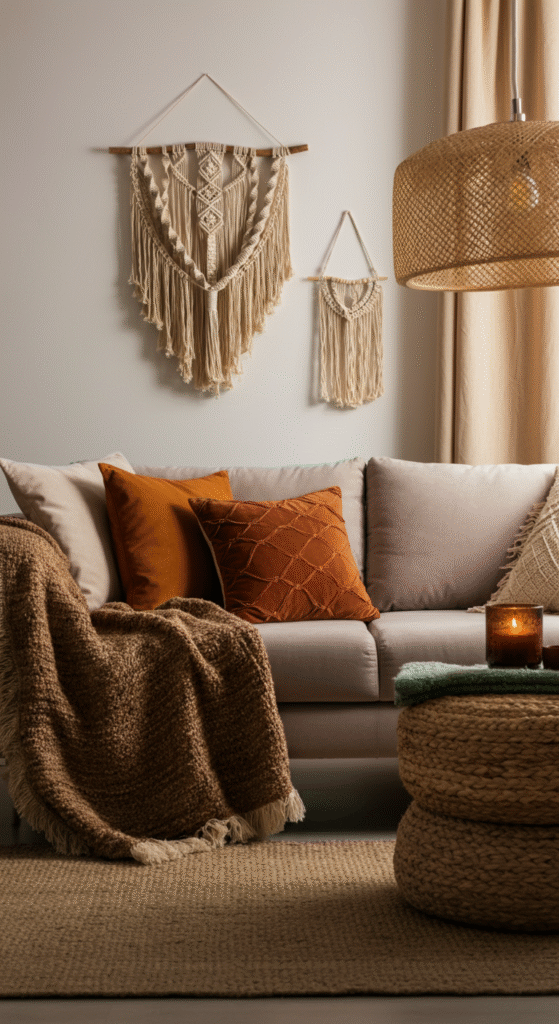 - Woven Textiles: Add woven wall hangings, macramé plant holders, or a cozy woven throw over the back of your couch to infuse texture.