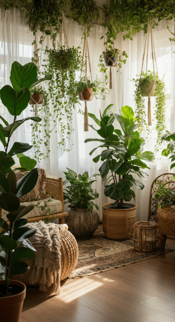 - Hanging Plants: Suspend your plants from the ceiling in woven baskets to create vertical greenery, adding dimension and life to the space.