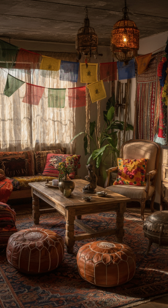 Opt for vintage or reclaimed wood furniture, comfortable sofas with throw blankets, and low-sitting chairs or poufs for a relaxed, earthy aesthetic.