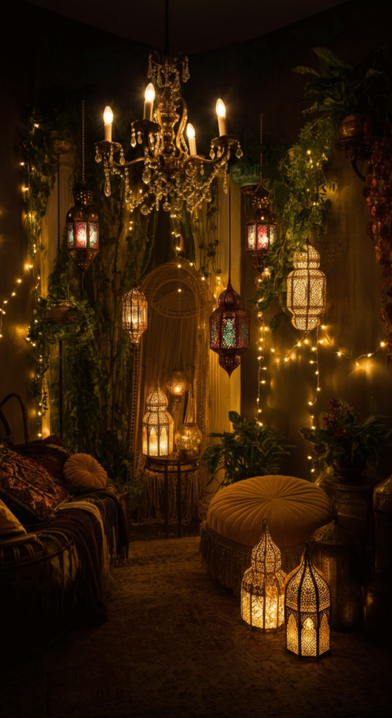 - Fairy Lights & Lanterns: Hang strings of fairy lights for a magical touch or use Moroccan lanterns for a soft, dim glow that adds character to your space.