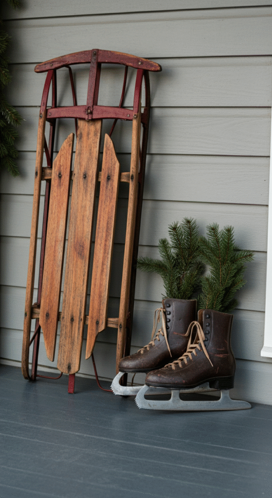 Nothing says nostalgic holiday charm like a wooden sled leaning against the porch wall. Pair it with a set of old-fashioned metal ice skates, and you instantly recreate a winter scene straight out of the 1940s.