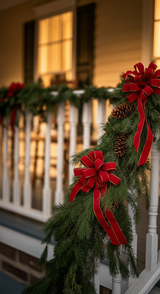 Traditional garlands wrapped around porch railings are one of the most timeless Christmas outdoor decorations. The combination of deep green foliage and rich red bows gives your home a festive yet elegant look.