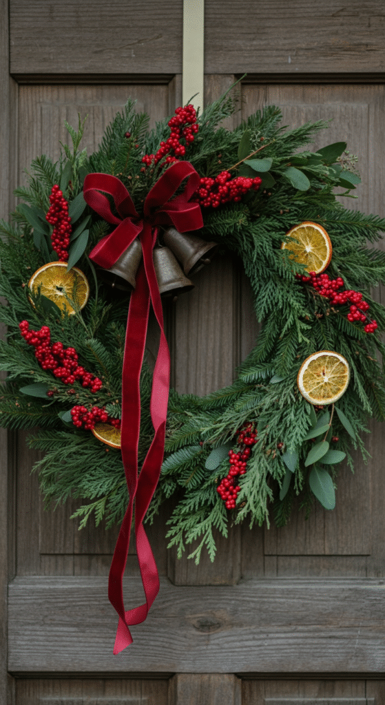 Enhance the wreath with old-style accents such as berries, dried fruits, velvet ribbons, or antique bells. Hanging the wreath on a wooden door makes the arrangement even more charming.