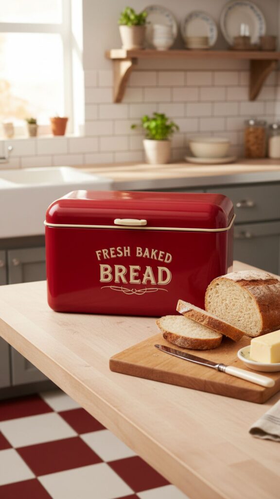 Before preservatives were common, the bread box was essential for keeping loaves fresh. A metal roll-top bread bin hides clutter, keeps your counters organized, and adds a distinct 1950s diner or farmhouse vibe to the room.
