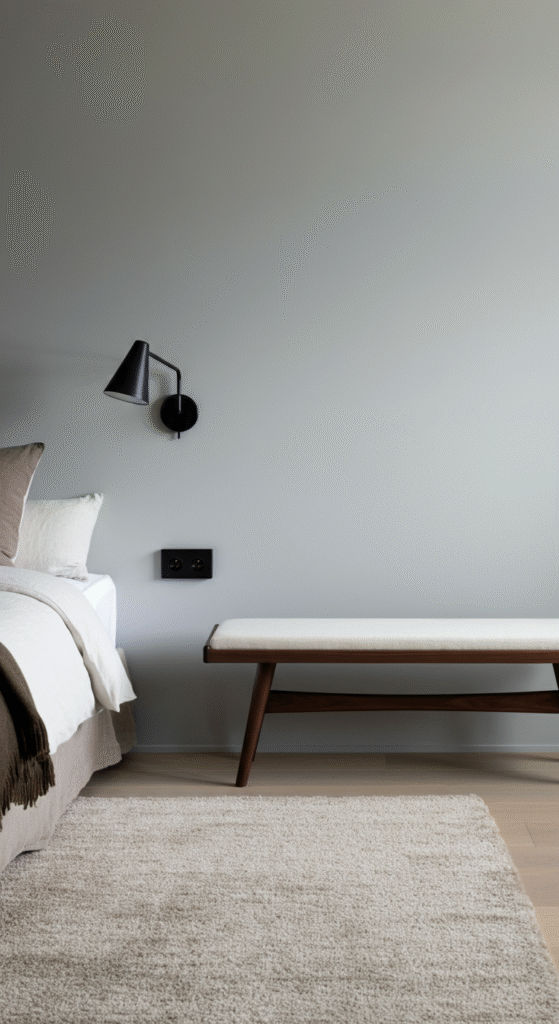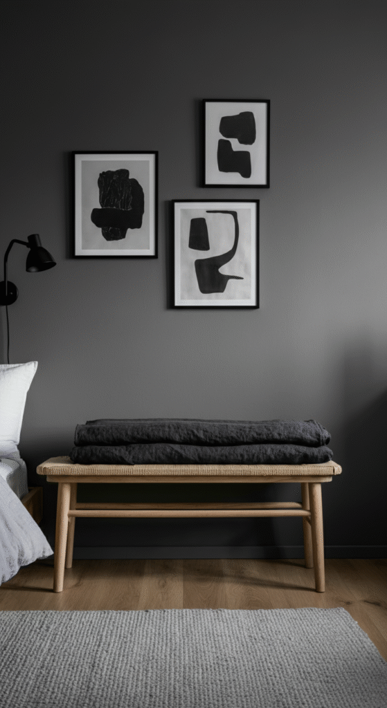 Pair your bench with matte black frames, an oversized mirror, and soft wool bedding in mixed gray tones for a cohesive monochrome scheme.