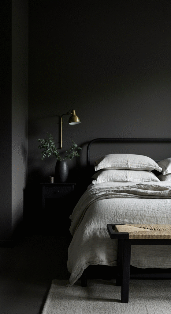 Scandinavian design isn’t just about whites and creams — monochrome palettes are equally iconic. The mix of ash wood and charcoal linen brings a modern, urban twist to the Nordic aesthetic.