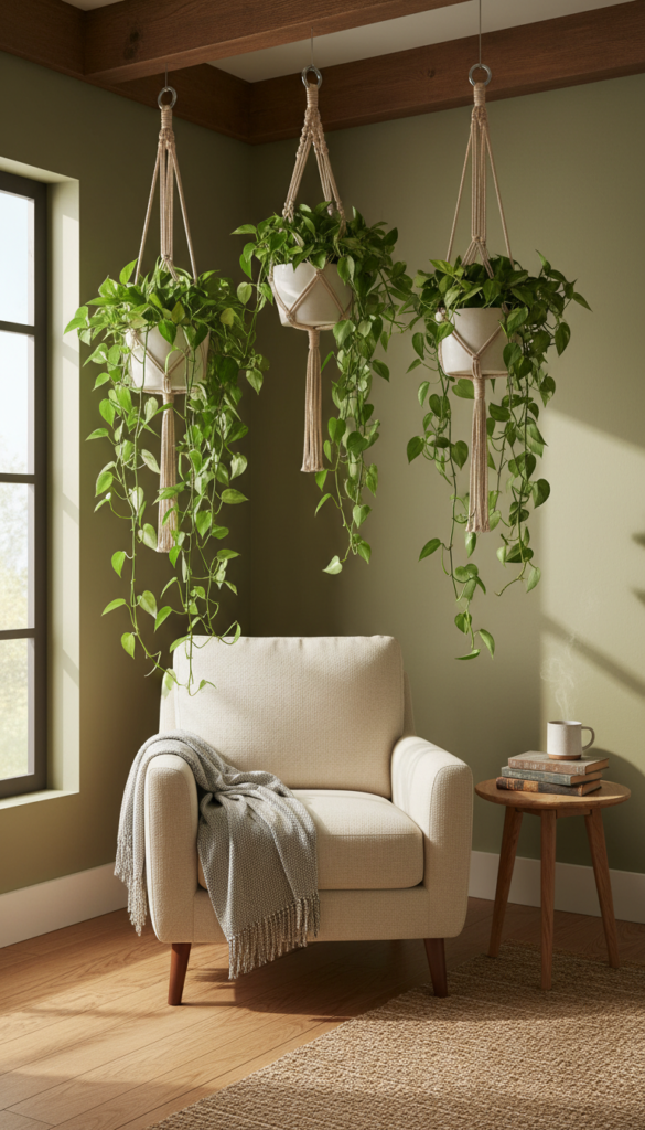 Bring the outdoors in by filling vertical space with hanging greenery. Whether real or high-quality artificial, vines like pothos or string of pearls cascading from the ceiling create that secret garden atmosphere essential to the Juminocore look.
