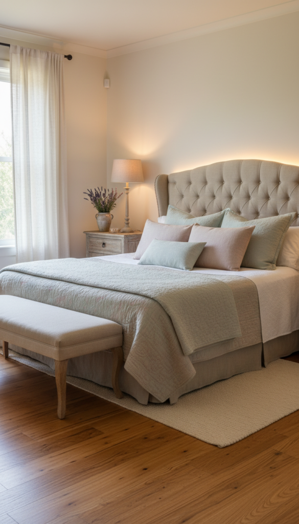 French Country bedrooms often feature tufted, linen-upholstered headboards. Installing a simple LED strip behind the headboard creates a halo effect. This separates the bed from the wall, adding depth to the room without being overwhelming. Ensure you choose a warm white setting (2700K-3000K) to complement the cream and beige tones typical of this aesthetic.