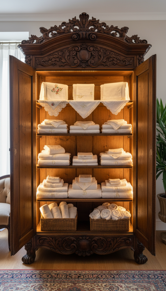 Large, wooden armoires are a staple of French interiors. To add a touch of boutique luxury, install motion-sensor LED strips inside the cabinet doors or along the shelving. When you open the doors to grab a sweater, the warm light illuminates the wood grain and your clothing, turning a dark piece of furniture into a functional display.