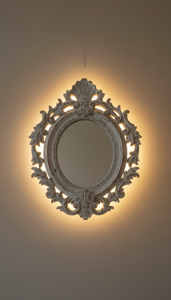 Gilded or distressed wood mirrors are common in this design style. placing an LED strip on the back of the mirror frame creates a silhouette effect against the wall. This works exceptionally well above a vanity or dresser. The light spills out from behind the ornate curves of the frame, emphasizing the craftsmanship while providing useful task lighting.