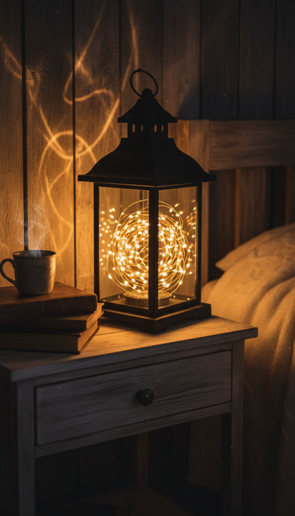 For a more whimsical approach, move away from adhesive strips and use LED copper wire strings (fairy lights). Coil a strand inside a vintage wire egg basket, a clear Mason jar, or an antique iron lantern. Place this on a nightstand or window sill. It mimics the look of fireflies or candlelight, perfectly matching the farmhouse vibe.