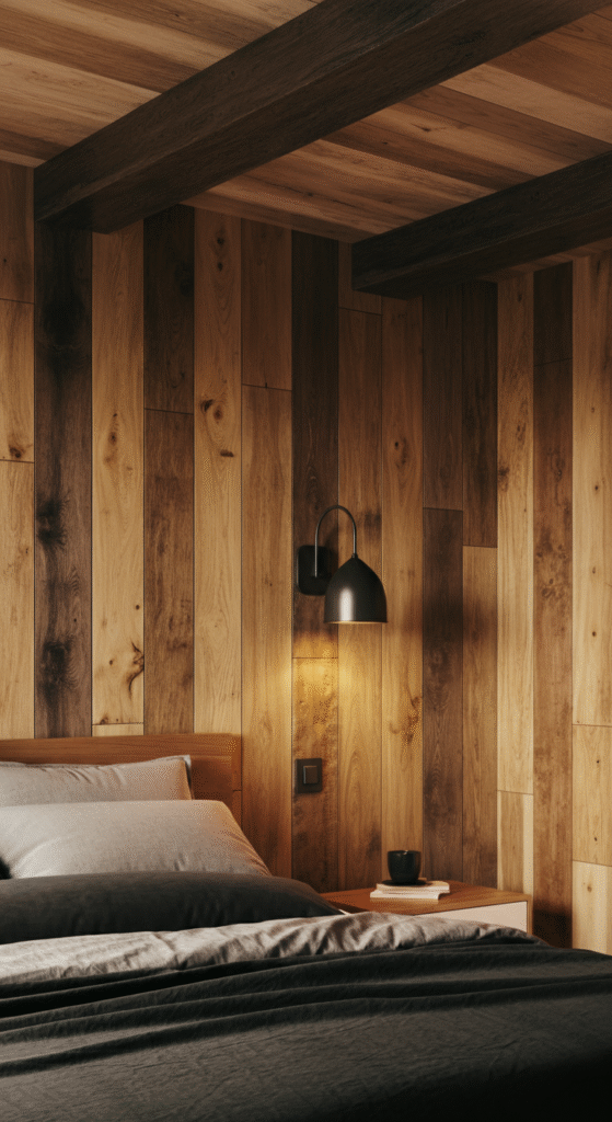 By mixing different wood finishes—like a natural light pine for the ceiling and darker walnut for the walls—you can create a layered, textured effect. Adding a large wooden bedframe or vintage wood furniture further enhances the rustic look, giving the room an authentic and earthy vibe.
