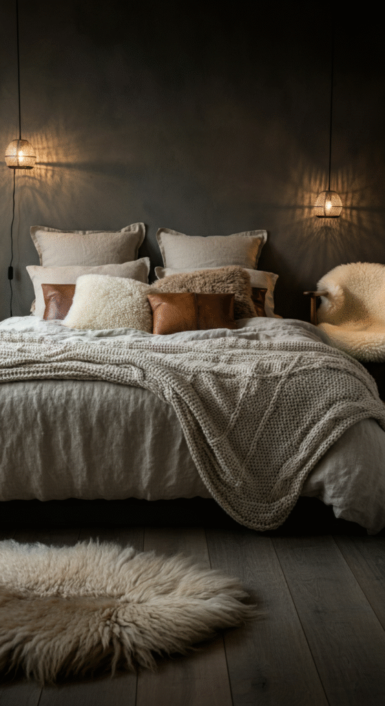 Use wood paneling on walls, a wooden bedframe, and layer textiles like woolen blankets and knitted throws for a cozy, inviting atmosphere.